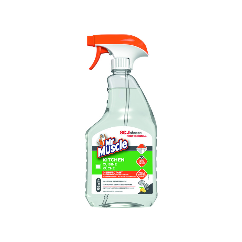 Mr Muscle Kitchen cleaner kills 99.99% of bacteria and specific viruses, including SARS-CoV-2. Formulated to easily tackle tough kitchen grease and grime found in busy commercial kitchens. Alwasy use biocides safely. Always read the label and product information before use. Organisms tested: Influenza H1N1 Virus, Murine Norovirus and SARS-CoV-2. Passes EN1276 & EN13697. Bottle is made of 100% post-consumer recycled plastic. (exluding sprayer and label).